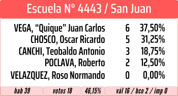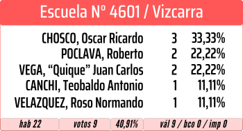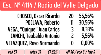Cuarto resultó «Quique» Vega, con 90 votos, y quinto fue Roso Normando Velazquez, con 3 votos (0,25%), un muy pobre resultado.