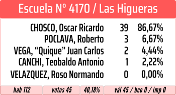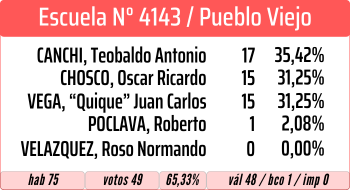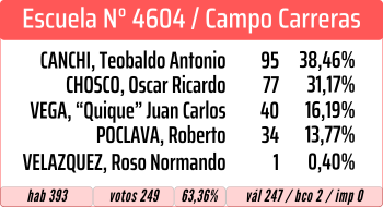 En la Escuela N° 4150, se impuso Canchi, segundo fue Poclava y tercero Chosco. En ambas escuelas, el cuarto y quinto lugar fue para «Quique» Vega y Roso Normando Velazquez.