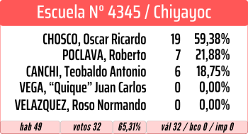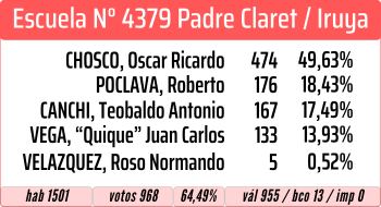 En el municipio Iruya, el ganador por amplio margen fue Oscar Ricardo Chosco, quien se impuso en diez de las quince localidades en las que se votó (ver votación escuela por escuela).